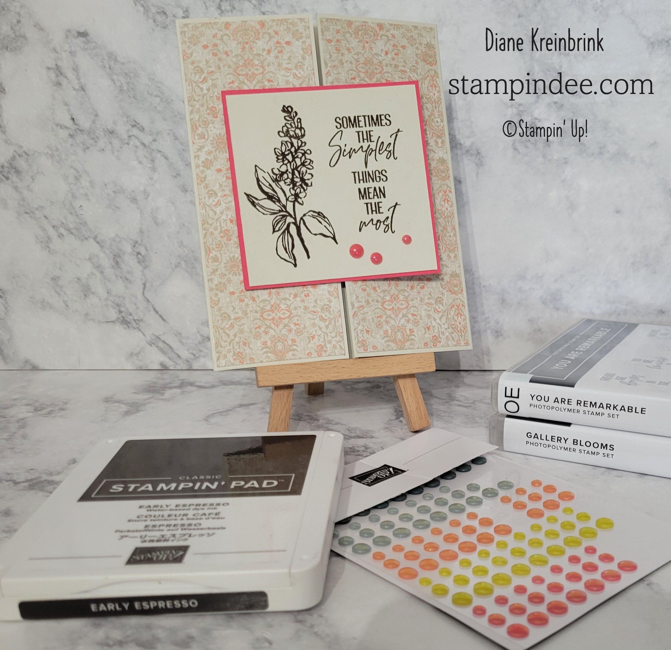 Discover ways to use the new Stampin’ Up! In Colors for your cards at 15% off. Try this fun fold, using Strawberry Splash as an accent to coordinate with the Beautiful Gallery Designer Series Paper. This fun fold highlights the You Are Remarkable and Gallery Blooms Stamp Sets. Finish this card off with a few 2025-2027 In Color Flat Pearls, and boom, it’s done.