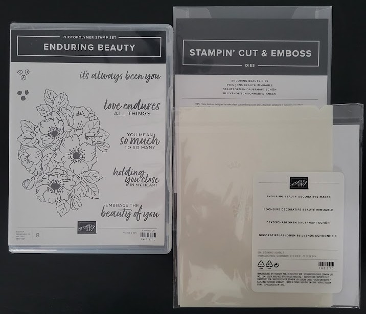 This brand-new retired Enduring Beauty bundle comes with 8 photopolymer stamps, 3 floral stamps and 5 sayings plus 10 coordinating dies and masks.