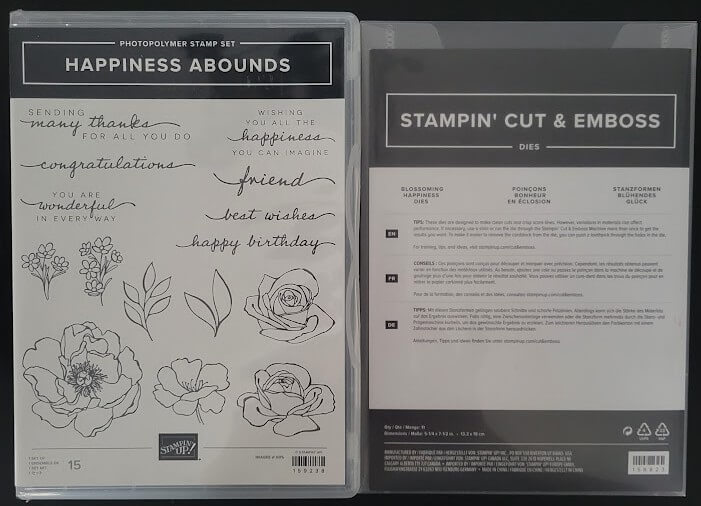 This gently used, retired Happiness Abounds bundle includes 15 photopolymer stamps, 8 floral stamps, 7 sayings, and 11 coordinating dies.