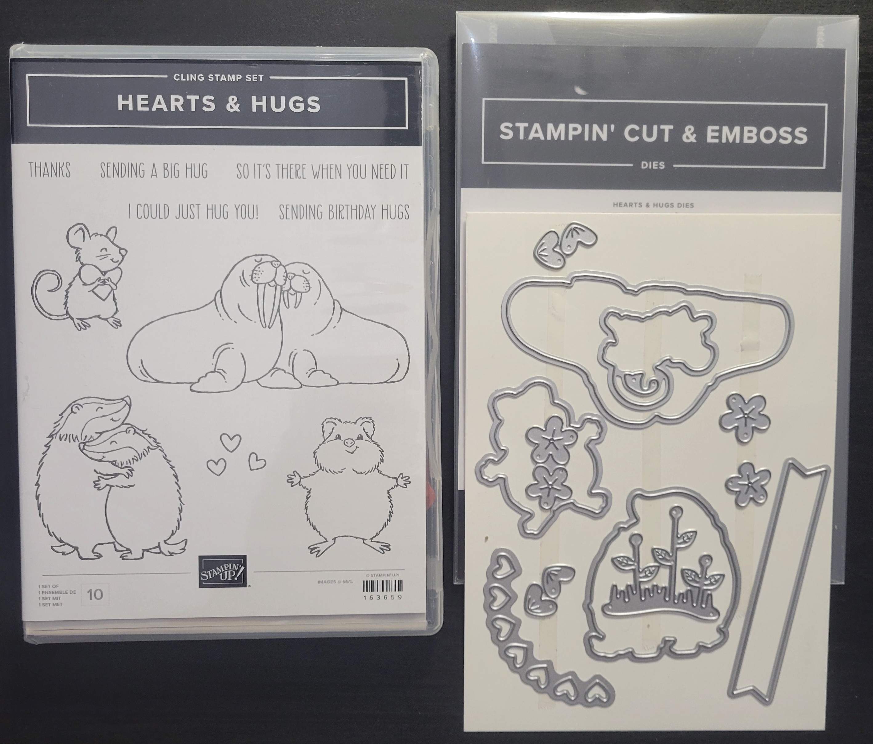 This gently used Hearts & Hugs bundle comes with 10 cling stamps, 4 adorable critter stamps and 5 sayings plus 12 coordinating dies.