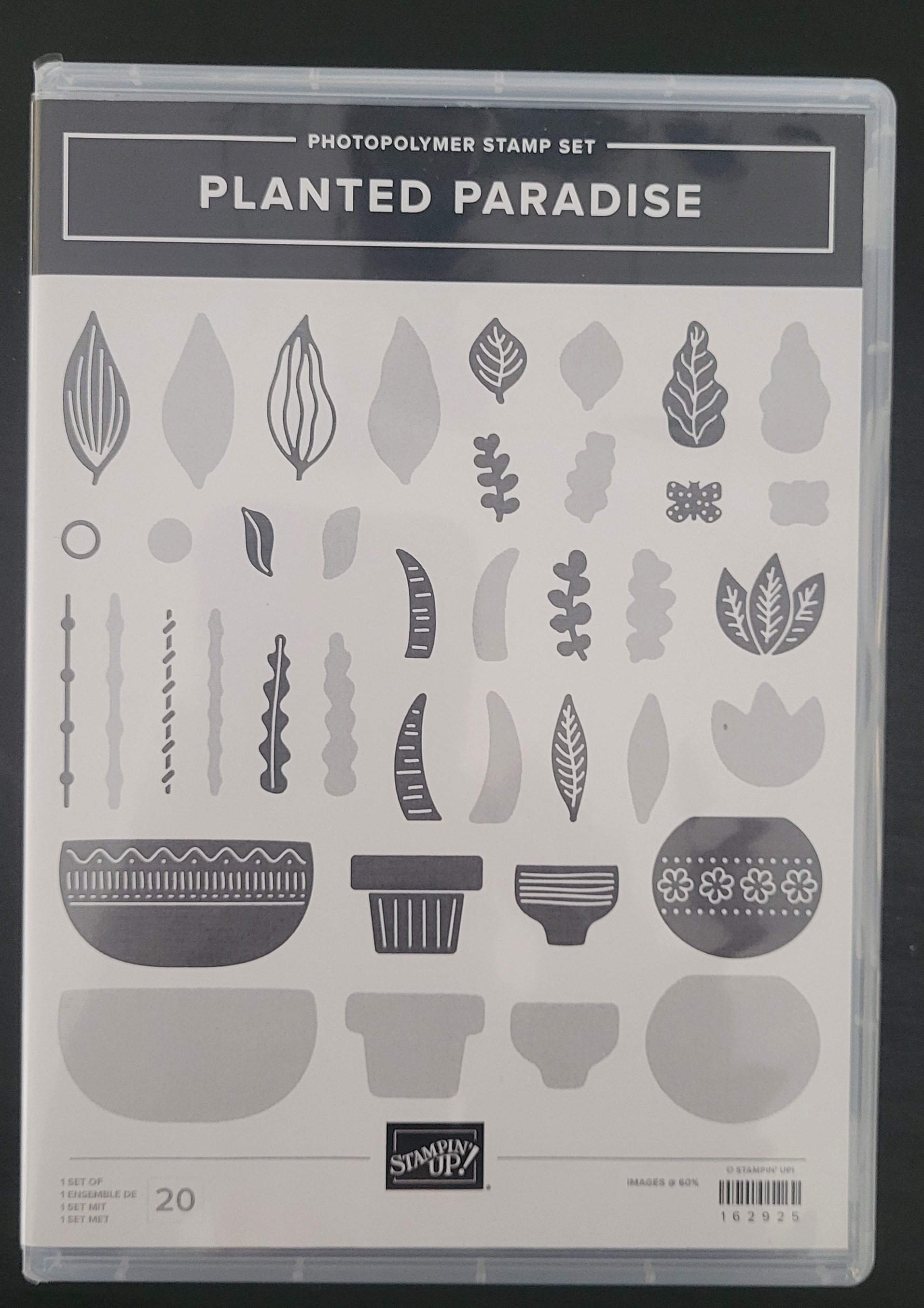 This brand-new retired Planted Paradise comes with 20 photopolymer stamps, 8 vase image stamps and 12 various plant and leaf images.