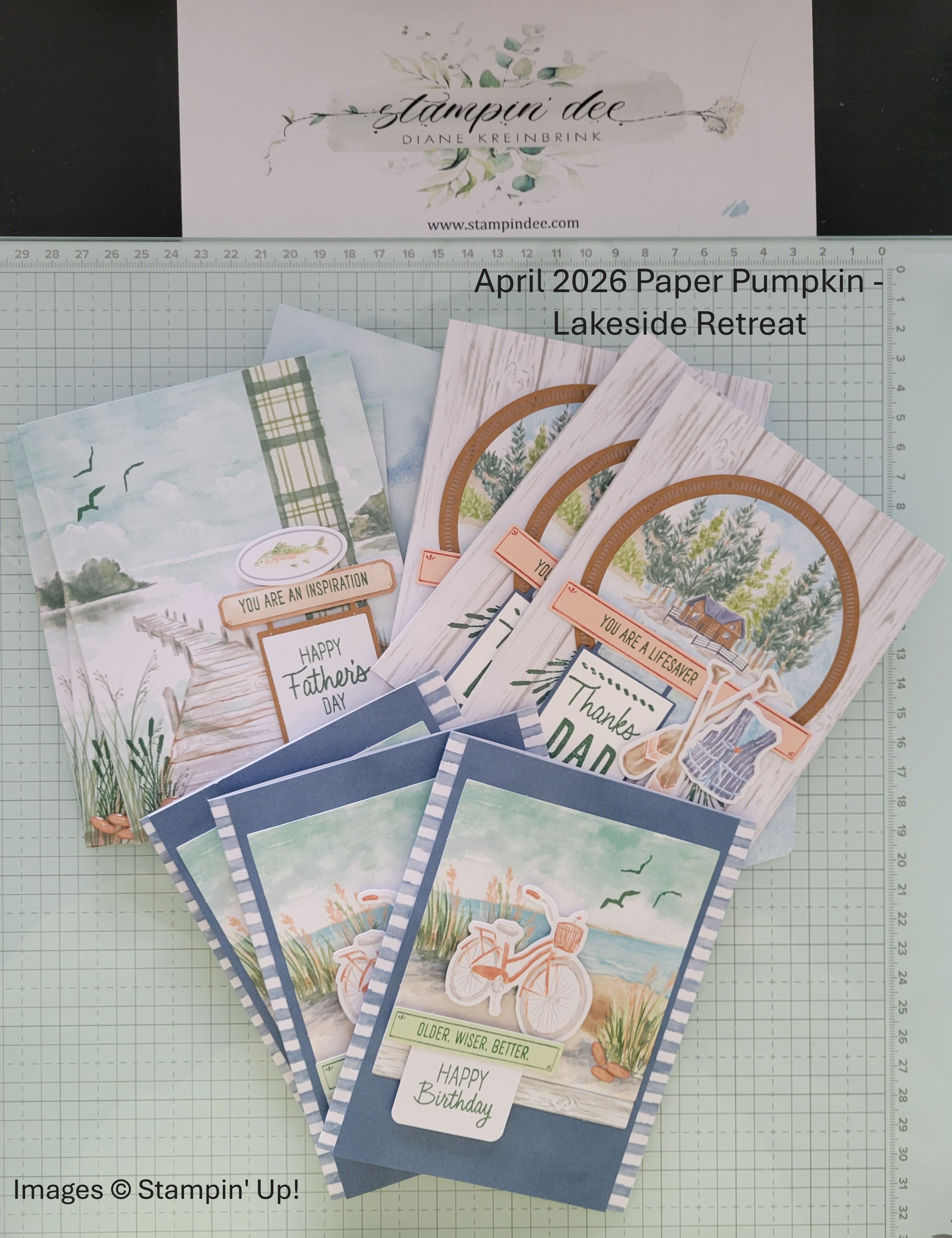April 2026 – Lakeside Retreat – This kit makes 9 cards, 3 of each design, and coordinates nicely with a new suite available May 5th, Waterside Retreat. Check out my cards. I think these are nice, masculine cards. You must subscribe by April 10th to receive this kit.